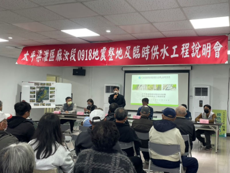 太平渠灌區麻汝段0918地震整地及臨時供水工程說明會於12月29日召開,由張處長麒瑋主持,農田水利署蔡署長昇甫、蔡主任秘書巧蓮、劉科長邦崇親臨與會。 說明會由農業工程研究中心劉博士日順,向在場農民說明農田隆起整地及臨時供水之施作規劃。在聽取農民意見後,署長特別指示,除圳路需求修復外,在二期作前盡可能配合農民整地需求。