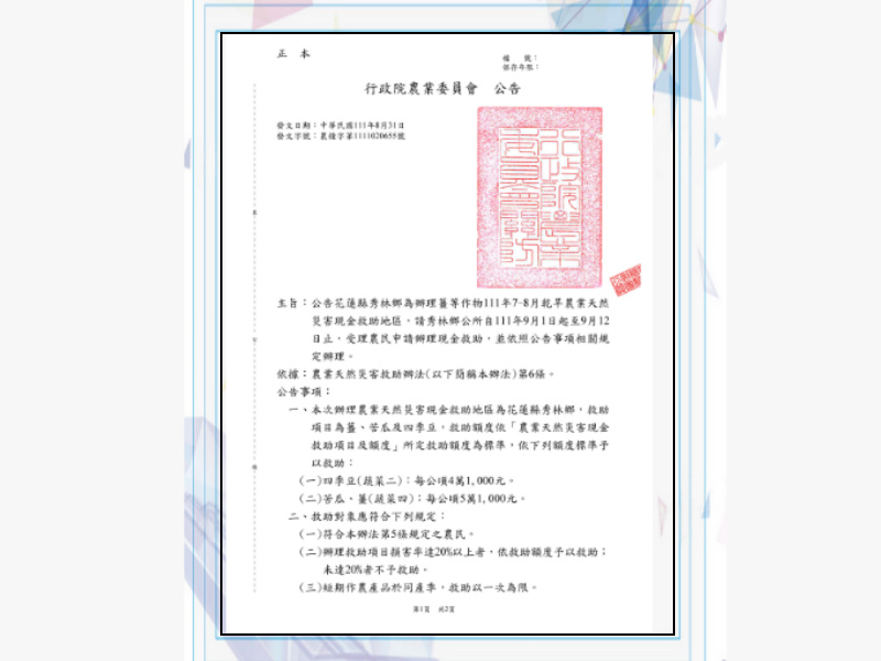 主旨:公告花蓮縣秀林鄉為辦理薑等作物111年7-8月乾旱農業天然災害現金救助地區,請秀林鄉公所自111年9月1日起至9月12日止,受理農民申請辦理現金救助,並依照公告事項相關規定辦理。