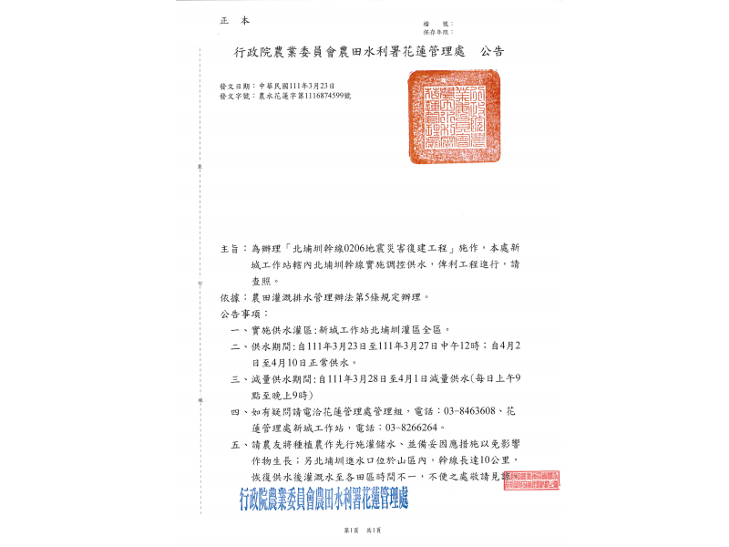 為辦理「北埔圳幹線0206地震災害復建工程」施作,停水公告