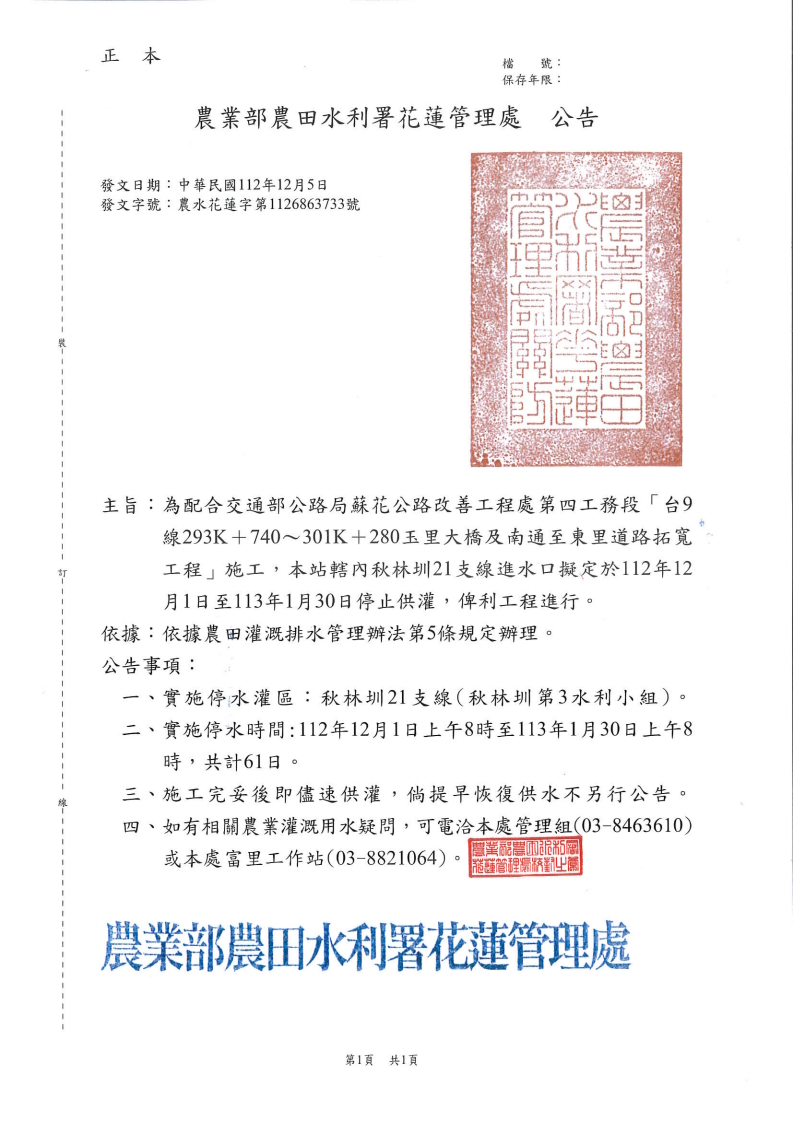 公告 為配合「台9線293K+740~301K+280玉里大橋及南通至東里道路拓寬工程」施工,富里秋林圳21支線實施停水供灌 實施停水灌區:秋林圳21支線(秋林圳第3水利小組)。 實施停水時間:112年12月1日上午8時至113年1月30日上午8時,共計61日。 施工完妥後即盡速供灌,倘提早恢復供水不另行公告。