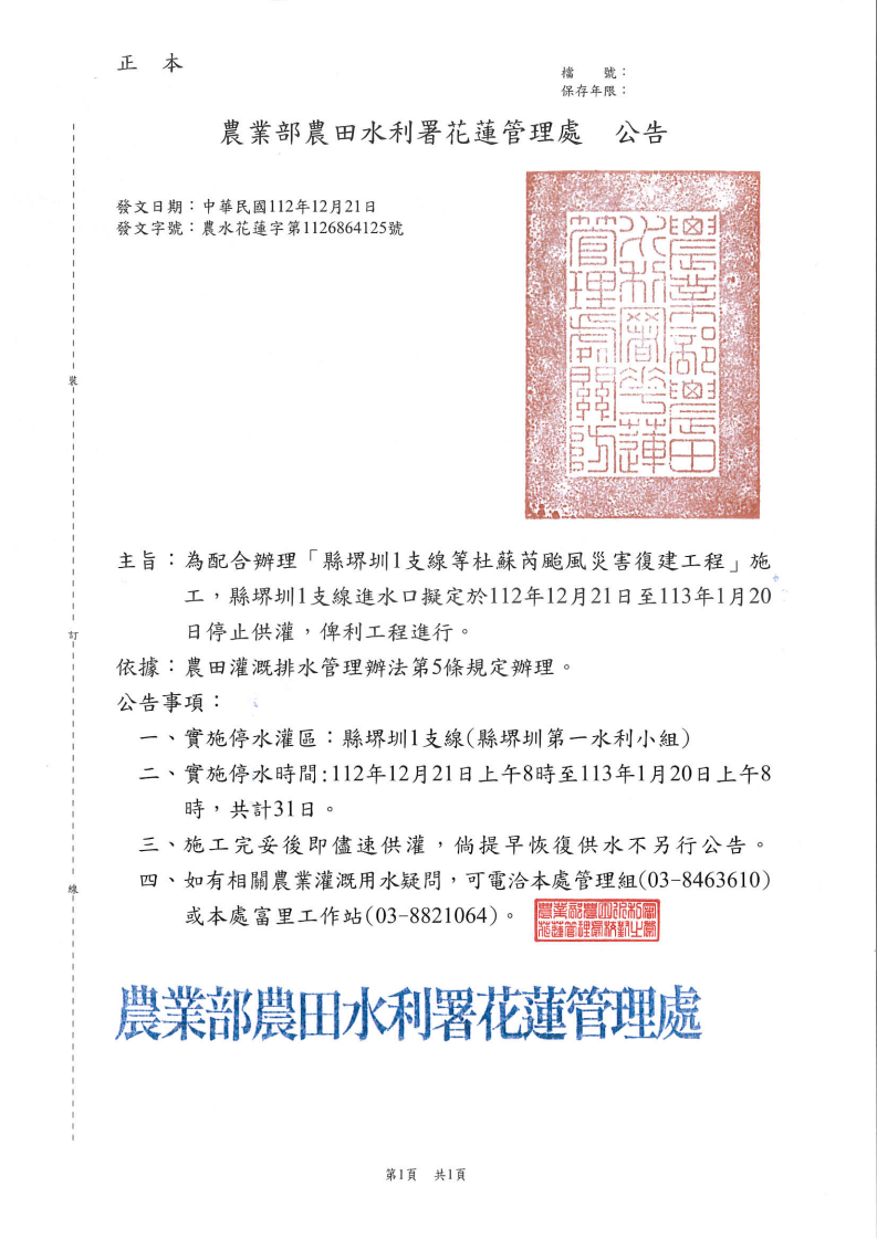 為配合辦理「縣堺圳1支線等杜蘇芮颱風災害復建工程」施工,富里鄉縣堺圳1支線進水口擬定於112年12月21日至113年1月20日停止供灌,俾利工程進行。