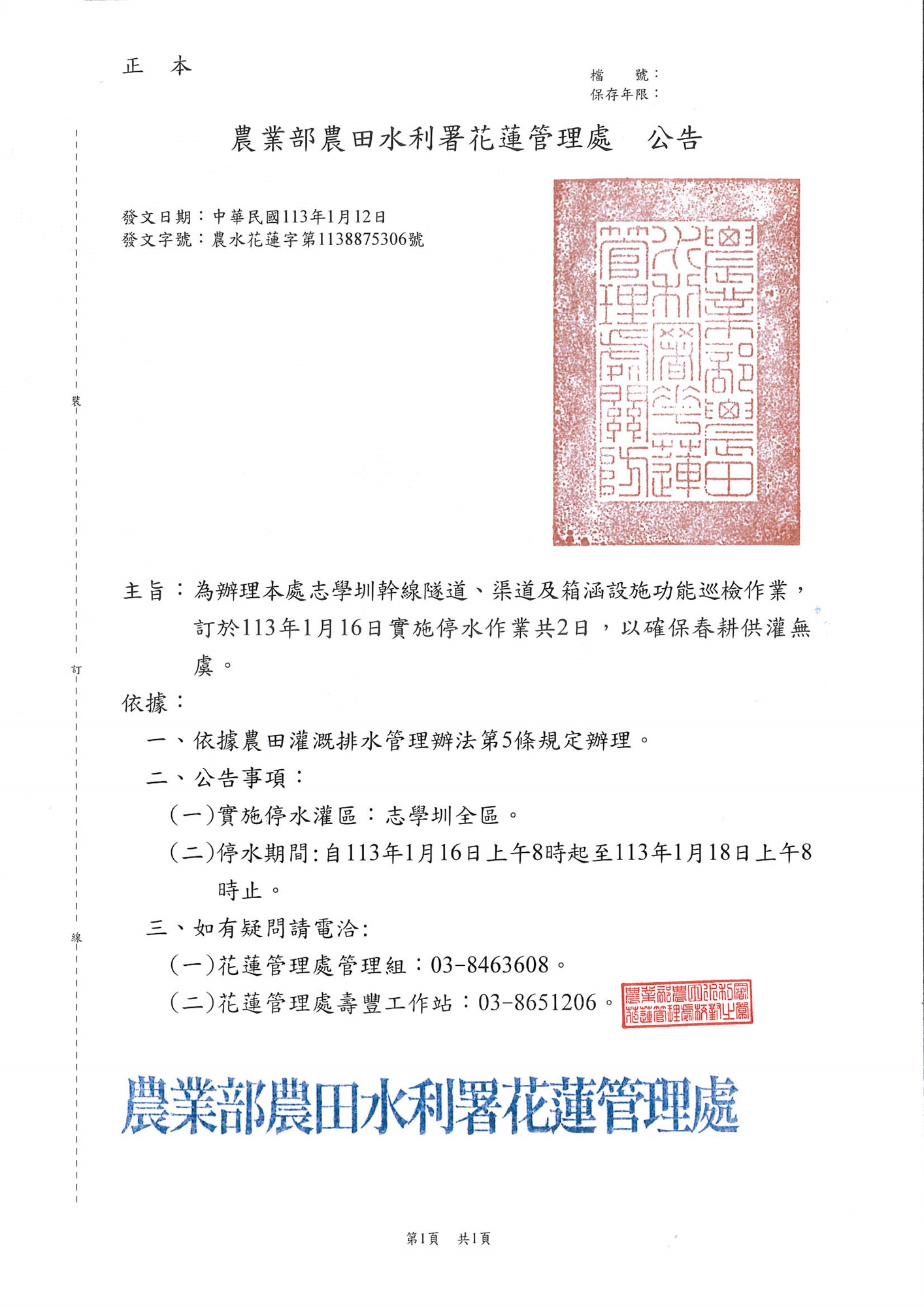 公告 為辦理本處志學圳幹線隧道、渠道及箱涵設施功能巡檢作業,訂於113年1月16日實施停水作業共2日,以確保春耕供灌無虞。 依據農田灌溉排水管理辦法第5條規定辦理。 公告事項: 實施停水灌區:志學圳全區。 停水期間:自113年1月16日上午8時起至113年1月18日上午8時止。 如有疑問請電洽: 花蓮管理處管理組:03-8463608 花蓮管理處壽豐工作站:03-8651206