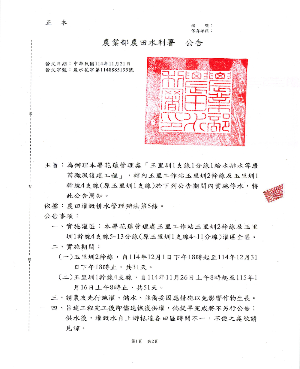 為辦理本署花蓮管理處「玉里圳1支線1分線1給水排水等康芮颱風復建工程」,轄內玉里工作站玉里圳2幹線及玉里圳1幹線4支線(原玉里圳1支線)於下列公告期間內實施停水,特此公告周知。