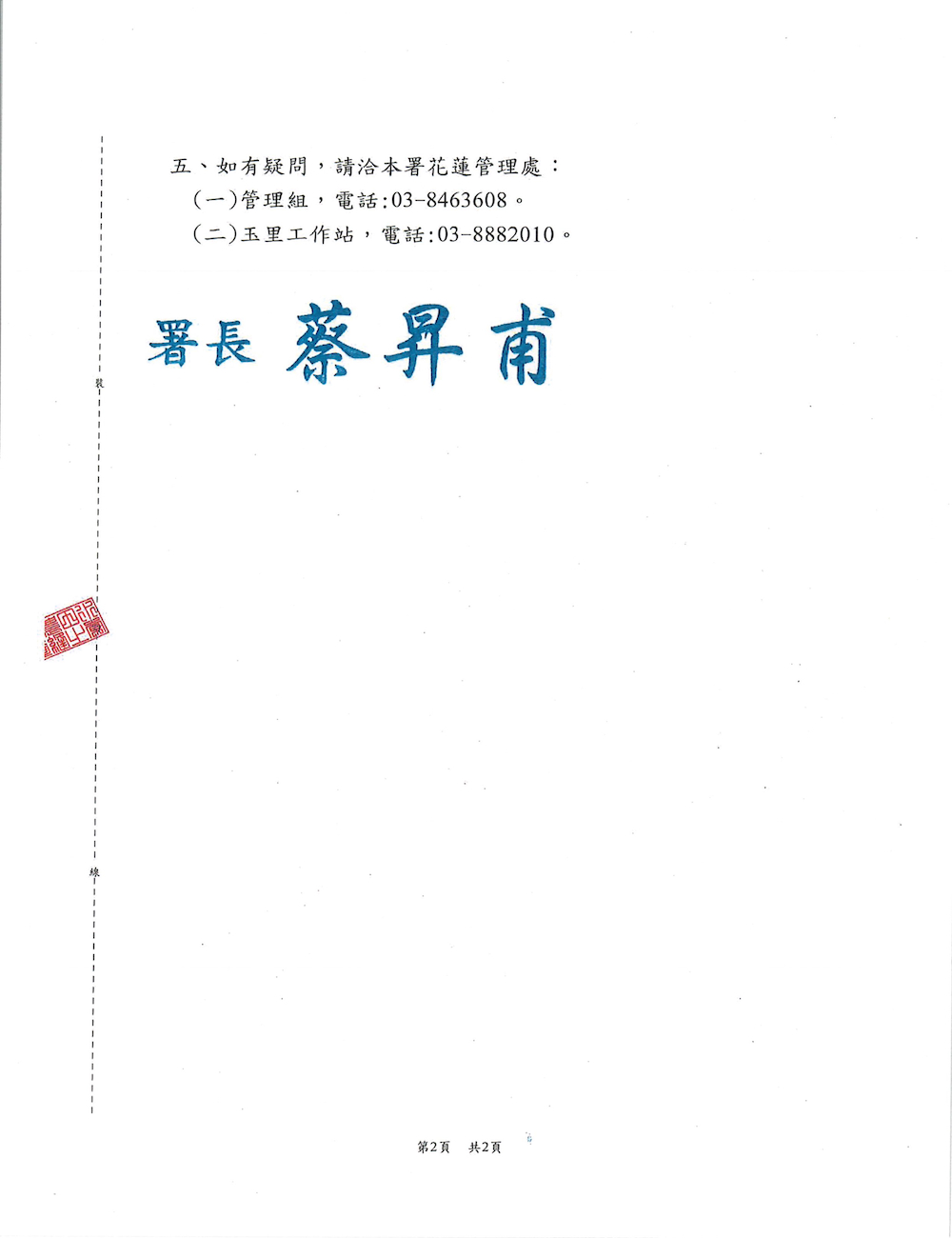五、如有疑問,請洽本署花蓮管理處:(一)管理組,電話:03-8463608。(二)玉里工作站,電話:03-8882010。