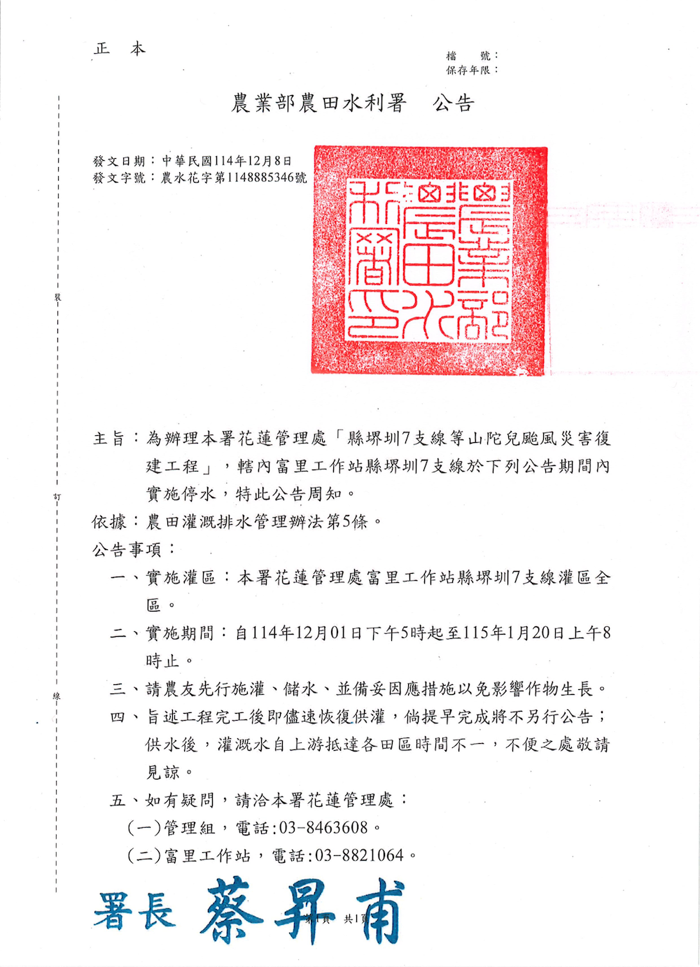 為辦理本署花蓮管理處「縣堺圳7支線等山陀兒颱風災害復建工程」,轄內富里工作站縣堺圳7支線於下列公告期間內實施停水,特此公告周知。
