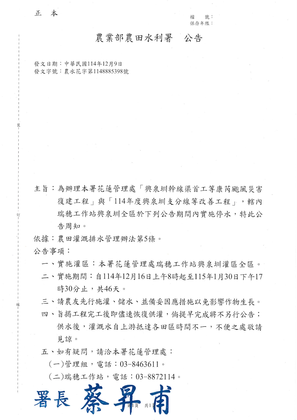 為辦理本署花蓮管理處「興泉圳幹線渠首工等康芮颱風災害 復建工程」與「114年度興泉圳支分線等改善工程」,轄內瑞穗工作站興泉圳全區於下列公告期間內實施停水,特此公告周知。