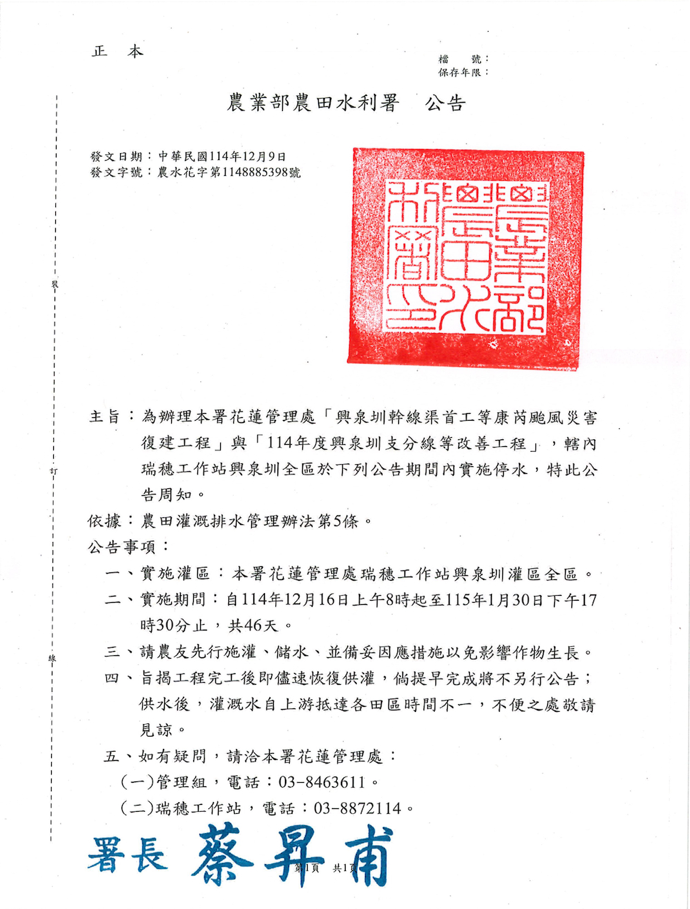 為辦理本署花蓮管理處「興泉圳幹線渠首工等康芮颱風災害 復建工程」與「114年度興泉圳支分線等改善工程」,轄內瑞穗工作站興泉圳全區於下列公告期間內實施停水,特此公告周知。