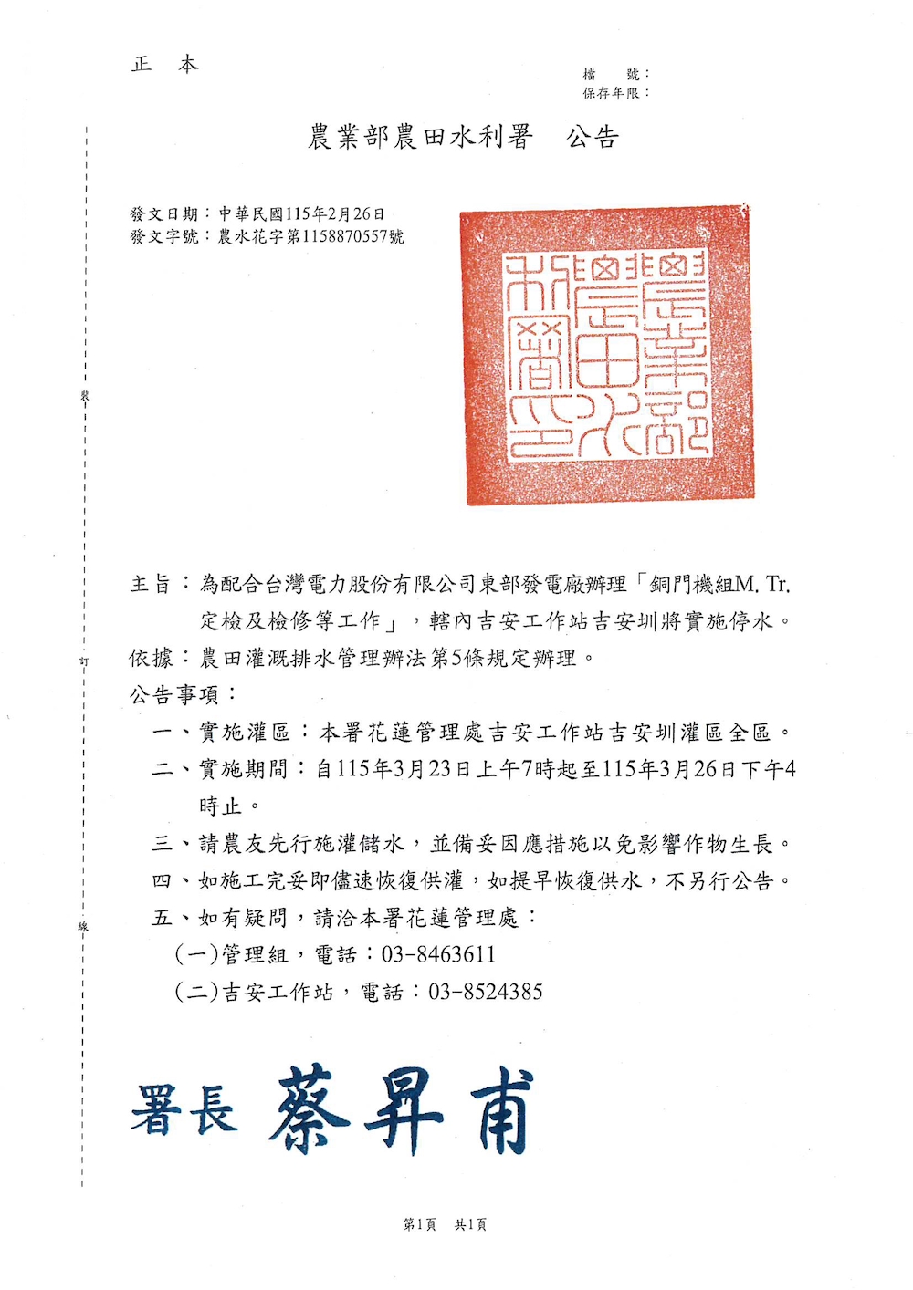 為配合台灣電力股份有限公司東部發電廠辦理「銅門機組M.Tr定檢及檢修等工作」,轄內吉安工作站吉安圳將實施停水。