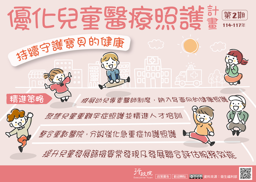 行政院自114年起擴大投入經費推動前述照護計畫,完善周產期新生兒、兒童的醫療連續照護,提升兒童發展篩檢及轉介效能等,衛福部積極整合醫療及社政系統量能,全面優化兒少醫療照護網絡,守護兒童安全。 在實踐「健康臺灣」施政願景中,為維護新生兒及兒童的生命健康,減少可預防的死亡或失能,行政院自114年起擴大投入經費,推動第2期「優化兒童醫療照護計畫」,依據兒童各方面醫療照護的需求,完善周產期新生兒、兒童的醫療連續照護,提升兒童發展篩檢及轉介的效能,強化兒童初級照護與健康管理,並精進兒童重難罕症照護及醫事人員的培訓。