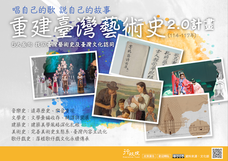 文化部今(12)日在行政院會報告「重建臺灣藝術史2.0」,文化部表示,為向國人介紹臺灣土地的藝術資產,找回令人感動的臺灣藝術故事,文化部自2018-2024年以前瞻基礎建設預算推動「重建臺灣藝術史計畫」。為能持續深化地方協力、民間投入,並實踐總統賴清德國家希望工程願景,文化部提出續辦理「重建臺灣藝術史2.0計畫」,並經行政院同意核定2025-2028年共14億元,期盼持續擴散效益,促成「土地x文化x世代」對話,找回臺灣藝術史及臺灣文化認同。