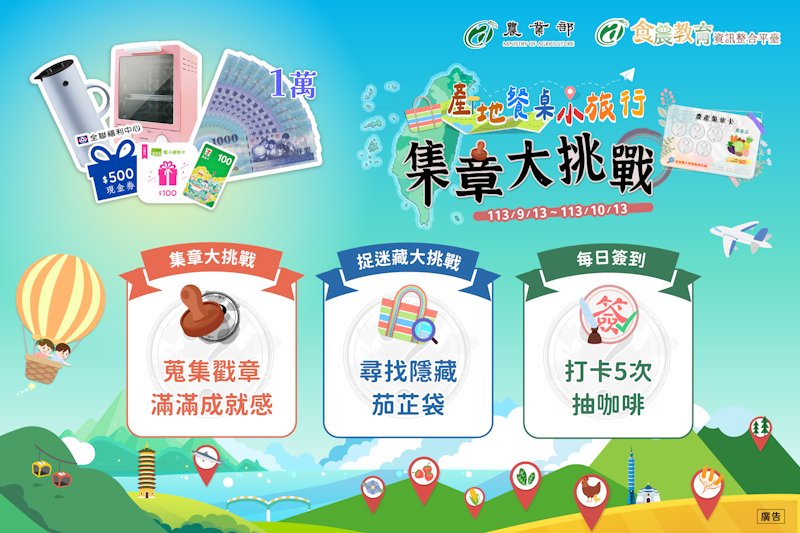 農業部「食農教育資訊整合平臺」於2024年9月13日至10月13日舉辦「產地餐桌小旅行 集章大挑戰」食農教育推廣活動,邀請全民跟著臺灣農產地圖五大主題「認識農產、在地特色、生產方式、挑選保存、料理加工」,來趟產地到餐桌的小旅行,透過遊戲的方式,強化臺灣農產品價值,推廣食農教育的理念。