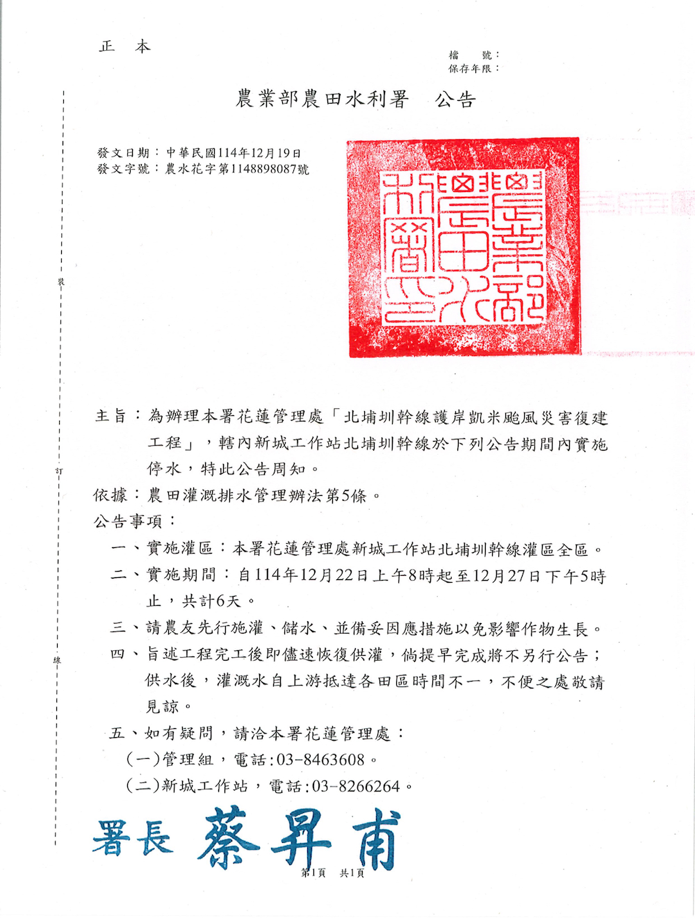 為辦理本署花蓮管理處「北埔圳幹線護岸凱米颱風災害復建工程」,轄內新城工作站北埔圳幹線於下列公告期間內實施停水,特此公告周知。
