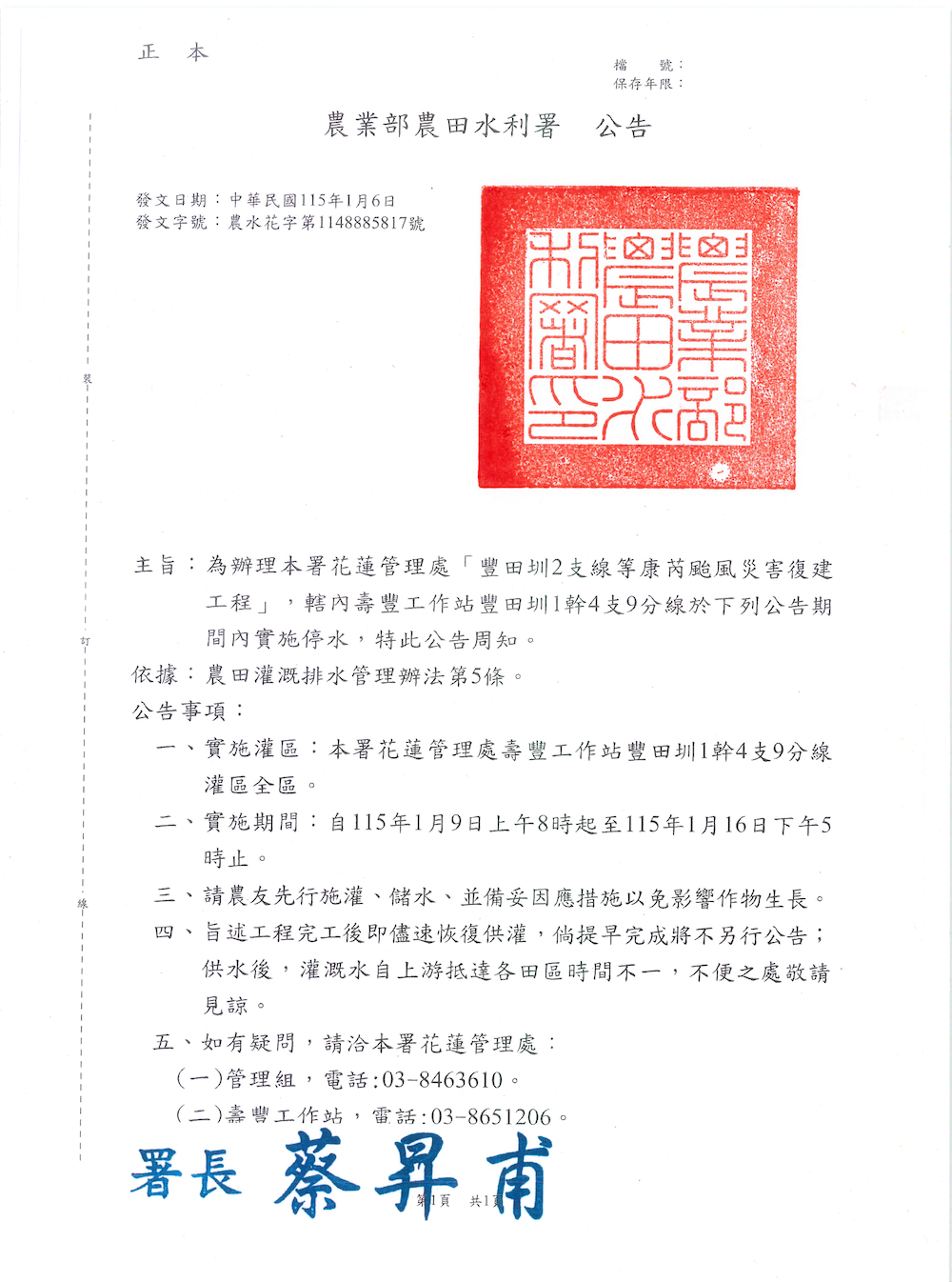 為辦理本署花蓮管理處「豐田圳2支線等康芮颱風災害復建工程」,轄內壽豐工作站豐田圳1幹4支9分線於下列公告期 間內實施停水,特此公告周知。