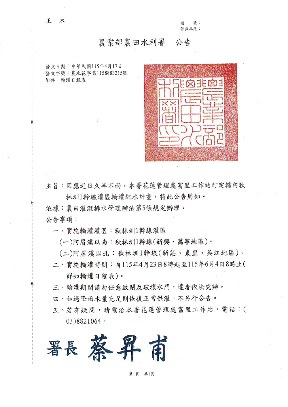 四丶如遇降雨水量充足則恢復正常供灌,不另行公告。