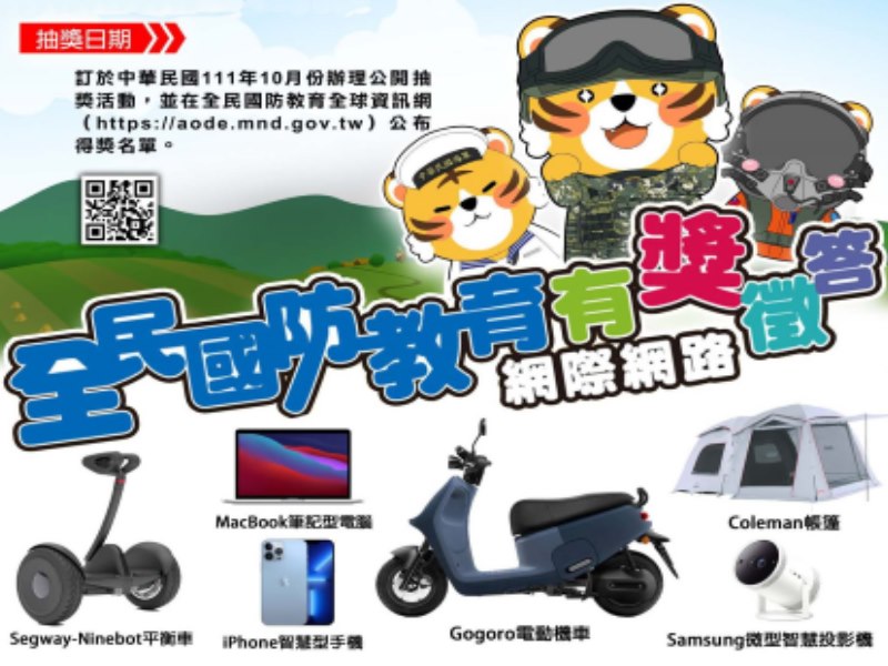 點選「全民國防教育有獎徵答」圖示,系統隨機抽選 10 道題目作答;全數答對者在網站留下個人基本資料與聯繫方式,即可參加抽獎活動。