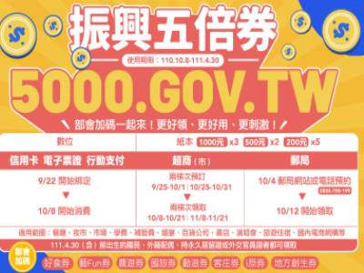 振興五倍券整體方案預估將創造新臺幣2,000億元的效益,不僅「更好領、更好用、更刺激」,也可較去年創造更大的振興效果,讓臺灣邁向新階段,全體國人過更好的生活。 https://5000.gov.tw/