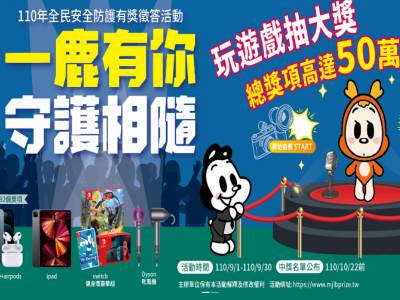 由法務部調查局主辦,全國安全防護工作會報協辦的110年全民安全防護有獎徵答「一鹿有你.守護相隨」活動自9月1日起強勢登場,玩遊戲抽大獎,總獎項高達50萬元,歡迎全國民眾踴躍參與,全民一起守護台灣。