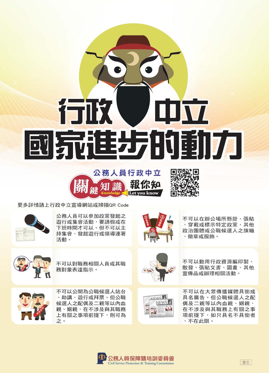 一、保訓會為因應113年第16任總統、副總統與第11屆立法委員選舉將屆,爰製作旨揭文宣品,並請各機關協助轉發所屬單位人員周知,以強化公務人員對於行政中立之瞭解,提醒公務人員應嚴守行政中立並維護行政中立之公務環境。 二、有關行政中立宣導之電子檔,均置放於保訓會全球資訊網「行政中立專區/圖像及影音電子檔」。
