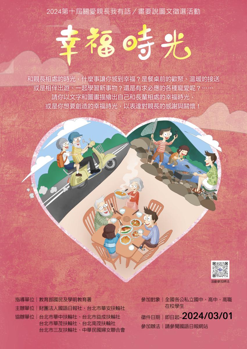 親長的愛與陪伴滋養了每個成長的心靈,邀請你以文字和圖畫描繪自己和父母、祖父母、教師或家族長輩間相處的幸福時光,或是你想要創造的幸福時光,表達對親長的感謝與關懷呵!