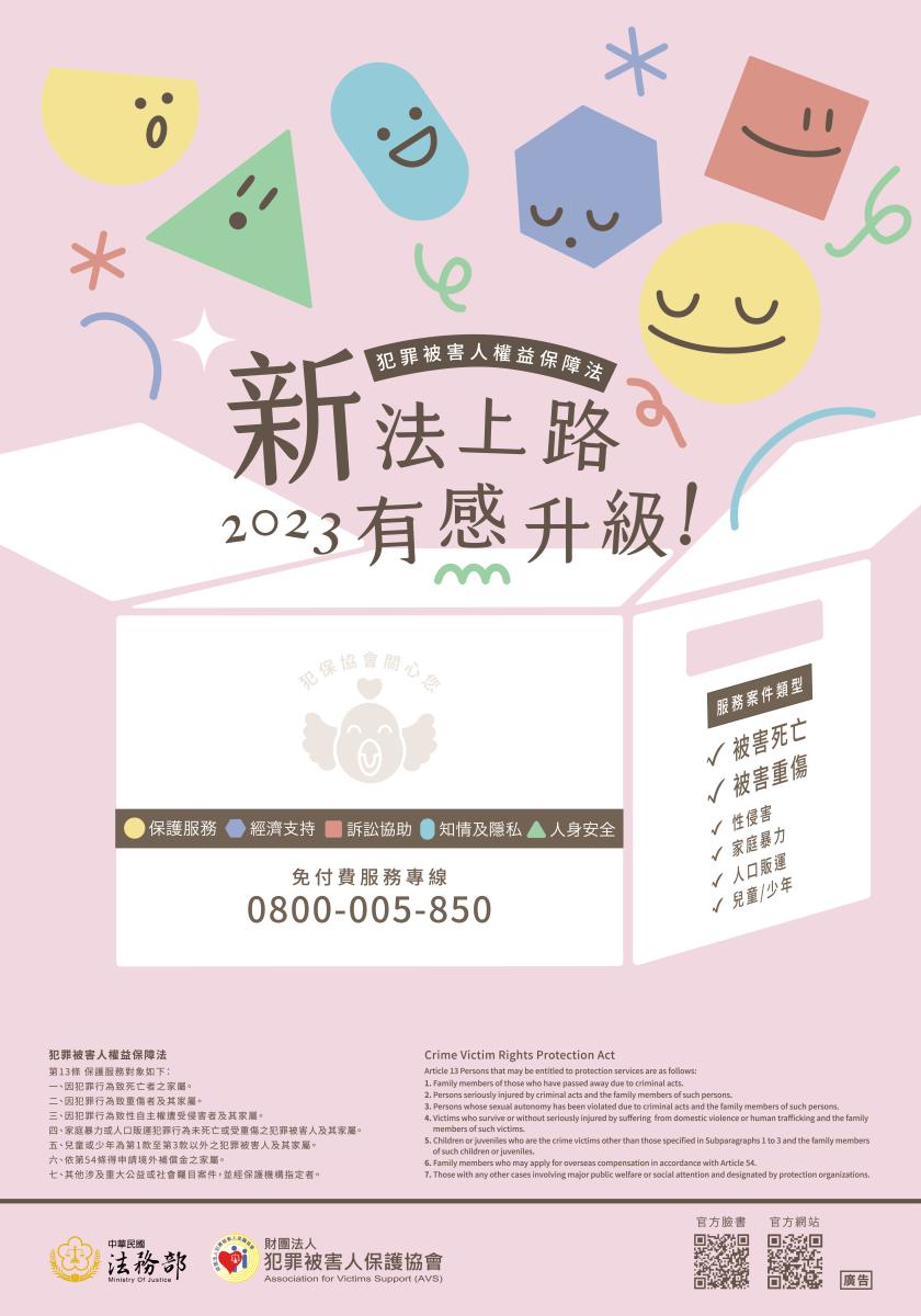 配合犯罪被害人權益保障法業於本(112)年2月8日總統華總 一義字第11200007261號令修正公布名稱及全文103條, 財團法人犯罪被害人保護協會製作新法重點宣導海報,強化社會大眾對犯保議題與相關服務之重視與了解。