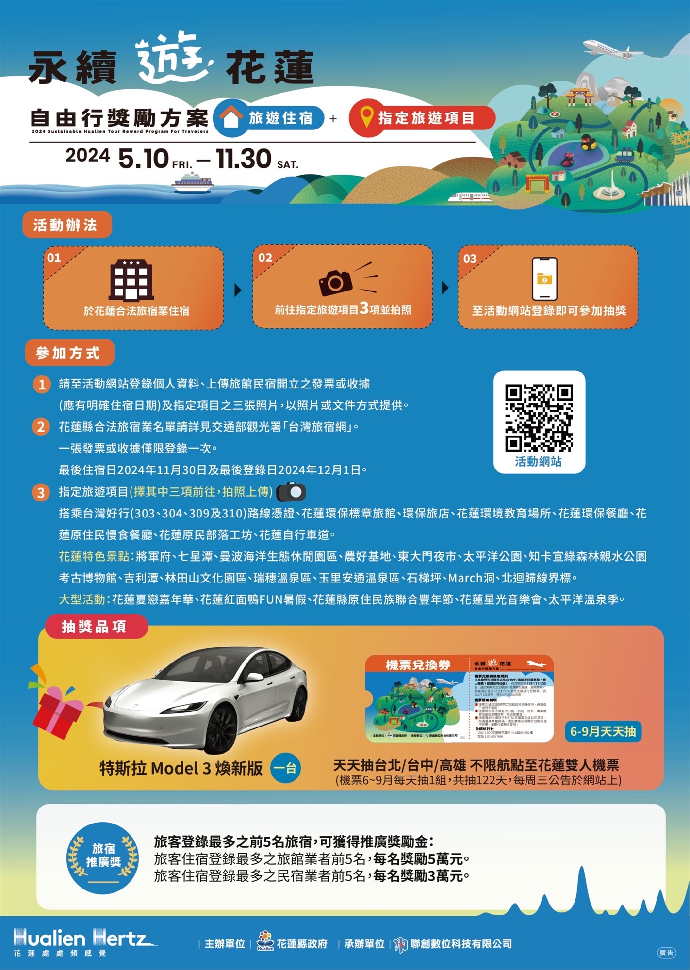 花蓮縣政府為鼓勵國人至花蓮旅遊住宿,自由行遊客在花蓮縣合法旅宿住宿,前往指定3項旅遊點,並於活動網站登錄即可參加抽獎。