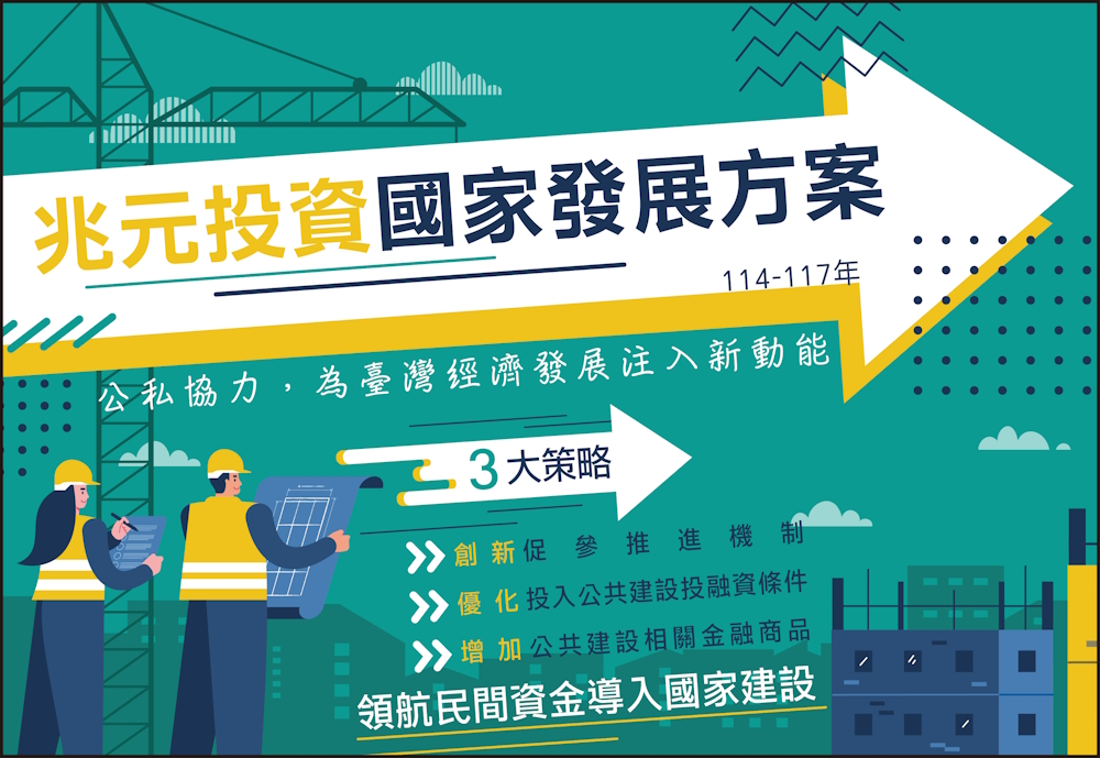 為實踐「國家希望工程」國政藍圖,政府刻正積極推動國家建設與產業發展,急需資金挹注,因考量民間資金充裕,亦積極尋求投資管道,若能將民間豐沛的資金導入各項建設,對於臺灣下一階段發展至關重要。鑑此,政府啟動「兆元投資國家發展方案」(114-117年),透過「業者承諾、政府協助」公私攜手的創新方式,引導兆元資金投資臺灣,在減輕政府財政負擔的同時,也讓民間獲得優質的投資標的,降低業者海外投資避險成本,發揮政府及民間雙贏的效益,為我國經濟發展注入新動能。