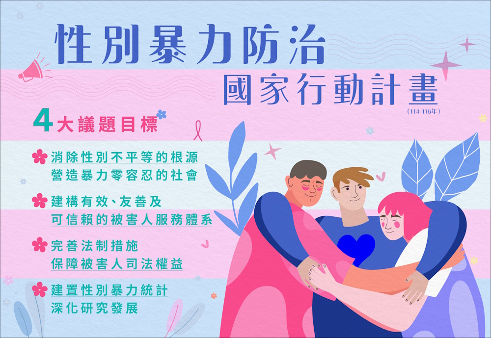 營造性別平權的社會,讓所有女性和不同性別者可以安心無懼、自由追求夢想,是國家的責任,為此行政院偕同司法院訂定「性別暴力防治國家行動計畫(114-116年)」。本計畫為我國首部國家級跨司法院、本院以及所屬部會的性別暴力防治計畫,展現政府對社會的承諾,將性別暴力防治列入國家整體發展策略,建立性別平權的社會,確保民眾免受性別暴力。