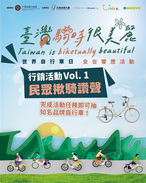 為響應今(114)年6月3日世界自行車日,交通部觀光署邀請國內公共自行車業者(YouBike、MOOVO)共同推出前導宣傳行銷活動,藉由結合公共自行車租借與在地騎乘挑戰,持續倡導綠色交通及低碳生活理念,並向國際傳遞臺灣作為自行車王國的獨特風采。在一系列豐富多元的騎乘活動,讓民眾在日常通勤與休閒運動中也能感受騎乘樂趣及參與環保永續行動。