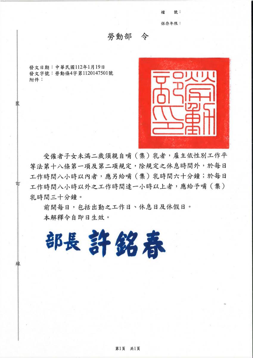 勞動部「性別工作平等法」第18條規定解釋令重點如下: 受僱者子女未滿二歲須親自哺(集)乳者,雇主依性別工 作平等法第十八條第一項及第二項規定,除規定之休息時 間外,於每日工作時間八小時以內者,應另給哺(集)乳 時間六十分鐘;於每日工作時間八小時以 外之工作時間達 一小時以上者,應給予哺(集)乳時間三十分鐘。 前開每日,包括出勤之工作日、休息日及休假日。 本解釋令自民國112年1月19日生效。